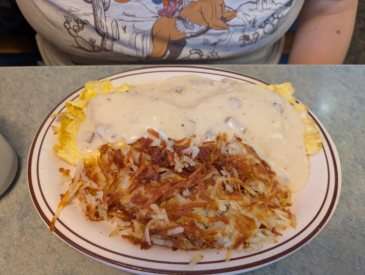 What a wonderful little slice of Americana diner in the middle of nowhere. My wife and I stopped by here after we got too tired on our road trip (and stayed at the comfort inn and suites nextdoor). The service was top notch here. Our coffee cups and water glasses were never more than half empty. Great banter with the waitress. My wife had the biscuits and gravy omelette, and I had the texas skillet. Absolutely incredible, 10/10 recommend. Especially the biscuits and gravy omelette, that was divine. Highly recommend his little spot if you are driving through and are hungry.